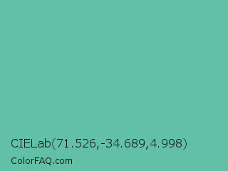 CIELab 71.526,-34.689,4.998 Color is a normal green color and the nearest color is Tradewind #5fb3ac. Hex code #61c0a5 and RGB value is rgb(97,192,165). In RGB color space, this color is composed of 38% red, 75% green, 65% blue, In CMYK color space, this color is composed of 49% cyan, 0% magenta, 14% yellow , 25% black , In HSL color space, this color has a hue angle of 163° , 43% saturation and 57% lightness.