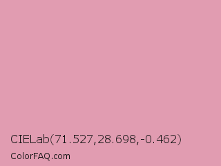 CIELab 71.527,28.698,-0.462 Color is a light rose color and the nearest color is Light Thulian Pink #e68fac. Hex code #e19cb1 and RGB value is rgb(225,156,177). In RGB color space, this color is composed of 88% red, 61% green, 69% blue, In CMYK color space, this color is composed of 0% cyan, 31% magenta, 21% yellow , 12% black , In HSL color space, this color has a hue angle of 342° , 53% saturation and 75% lightness.
