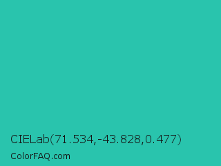 CIELab 71.534,-43.828,0.477 Color is a normal cyan color and the nearest color is Maximum Blue Green #30bfbf. Hex code #29c4ad and RGB value is rgb(41,196,173). In RGB color space, this color is composed of 16% red, 77% green, 68% blue, In CMYK color space, this color is composed of 79% cyan, 0% magenta, 12% yellow , 23% black , In HSL color space, this color has a hue angle of 171° , 65% saturation and 46% lightness.