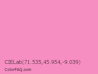 CIELab 71.535,45.954,-9.039 Color is a light rose color and the nearest color is Pastel Magenta #f49ac2. Hex code #f78ec1 and RGB value is rgb(247,142,193). In RGB color space, this color is composed of 97% red, 56% green, 76% blue, In CMYK color space, this color is composed of 0% cyan, 43% magenta, 22% yellow , 3% black , In HSL color space, this color has a hue angle of 331° , 87% saturation and 76% lightness.