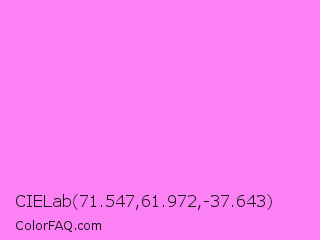 CIELab 71.547,61.972,-37.643 Color is a light magenta color and the nearest color is Light Fuchsia Pink #f984ef. Hex code #fc81f5 and RGB value is rgb(252,129,245). In RGB color space, this color is composed of 99% red, 51% green, 96% blue, In CMYK color space, this color is composed of 0% cyan, 49% magenta, 3% yellow , 1% black , In HSL color space, this color has a hue angle of 303° , 95% saturation and 75% lightness.