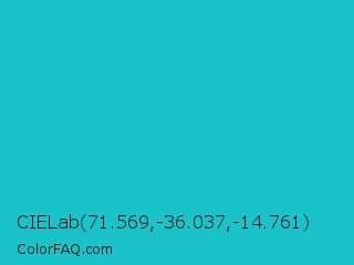 CIELab 71.569,-36.037,-14.761 Color is a normal cyan color and the nearest color is Java #1fc2c2. Hex code #1ac2c9 and RGB value is rgb(26,194,201). In RGB color space, this color is composed of 10% red, 76% green, 79% blue, In CMYK color space, this color is composed of 87% cyan, 3% magenta, 0% yellow , 21% black , In HSL color space, this color has a hue angle of 182° , 77% saturation and 45% lightness.