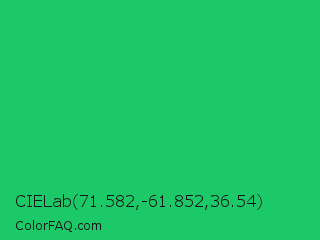 CIELab 71.582,-61.852,36.54 Color is a normal green color and the nearest color is Green Crayola #1cac78. Hex code #1cc969 and RGB value is rgb(28,201,105). In RGB color space, this color is composed of 11% red, 79% green, 41% blue, In CMYK color space, this color is composed of 86% cyan, 0% magenta, 48% yellow , 21% black , In HSL color space, this color has a hue angle of 147° , 76% saturation and 45% lightness.