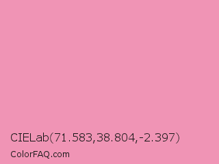 CIELab 71.583,38.804,-2.397 Color is a light rose color and the nearest color is Amaranth Pink #f19cbb. Hex code #f094b5 and RGB value is rgb(240,148,181). In RGB color space, this color is composed of 94% red, 58% green, 71% blue, In CMYK color space, this color is composed of 0% cyan, 38% magenta, 25% yellow , 6% black , In HSL color space, this color has a hue angle of 338° , 75% saturation and 76% lightness.