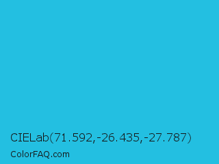 CIELab 71.592,-26.435,-27.787 Color is a normal cyan color and the nearest color is Scooter #2ebfd4. Hex code #23bfe1 and RGB value is rgb(35,191,225). In RGB color space, this color is composed of 14% red, 75% green, 88% blue, In CMYK color space, this color is composed of 84% cyan, 15% magenta, 0% yellow , 12% black , In HSL color space, this color has a hue angle of 191° , 76% saturation and 51% lightness.