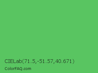 CIELab 71.5,-51.57,40.671 Color is a normal green color and the nearest color is Fern #63b76c. Hex code #59c561 and RGB value is rgb(89,197,97). In RGB color space, this color is composed of 35% red, 77% green, 38% blue, In CMYK color space, this color is composed of 55% cyan, 0% magenta, 51% yellow , 23% black , In HSL color space, this color has a hue angle of 124° , 48% saturation and 56% lightness.