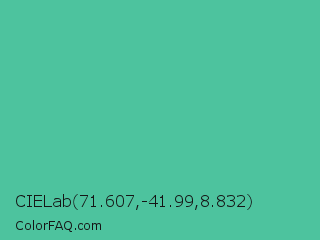 CIELab 71.607,-41.99,8.832 Color is a normal green color and the nearest color is Ocean Green #48bf91. Hex code #4dc39e and RGB value is rgb(77,195,158). In RGB color space, this color is composed of 30% red, 76% green, 62% blue, In CMYK color space, this color is composed of 61% cyan, 0% magenta, 19% yellow , 24% black , In HSL color space, this color has a hue angle of 161° , 50% saturation and 53% lightness.