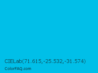 CIELab 71.615,-25.532,-31.574 Color is a normal cyan color and the nearest color is Cyan Process #00b7eb. Hex code #00bfe8 and RGB value is rgb(0,191,232). In RGB color space, this color is composed of 0% red, 75% green, 91% blue, In CMYK color space, this color is composed of 100% cyan, 18% magenta, 0% yellow , 9% black , In HSL color space, this color has a hue angle of 191° , 100% saturation and 45% lightness.