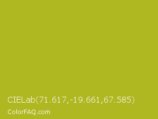 CIELab 71.617,-19.661,67.585 Color is a normal yellow color and the nearest color is Acid Green #b0bf1a. Hex code #afb721 and RGB value is rgb(175,183,33). In RGB color space, this color is composed of 69% red, 72% green, 13% blue, In CMYK color space, this color is composed of 4% cyan, 0% magenta, 82% yellow , 28% black , In HSL color space, this color has a hue angle of 63° , 69% saturation and 42% lightness.