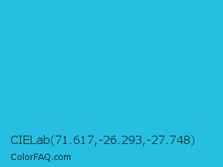 CIELab 71.617,-26.293,-27.748 Color is a normal cyan color and the nearest color is Scooter #2ebfd4. Hex code #25bfe1 and RGB value is rgb(37,191,225). In RGB color space, this color is composed of 15% red, 75% green, 88% blue, In CMYK color space, this color is composed of 84% cyan, 15% magenta, 0% yellow , 12% black , In HSL color space, this color has a hue angle of 191° , 76% saturation and 51% lightness.