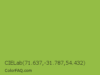 CIELab 71.637,-31.787,54.432 Color is a normal green color and the nearest color is Android Green #a4c639. Hex code #94bd45 and RGB value is rgb(148,189,69). In RGB color space, this color is composed of 58% red, 74% green, 27% blue, In CMYK color space, this color is composed of 22% cyan, 0% magenta, 63% yellow , 26% black , In HSL color space, this color has a hue angle of 81° , 48% saturation and 51% lightness.