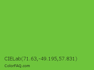 CIELab 71.63,-49.195,57.831 Color is a normal green color and the nearest color is Green RYB #66b032. Hex code #6ec43b and RGB value is rgb(110,196,59). In RGB color space, this color is composed of 43% red, 77% green, 23% blue, In CMYK color space, this color is composed of 44% cyan, 0% magenta, 70% yellow , 23% black , In HSL color space, this color has a hue angle of 98° , 54% saturation and 50% lightness.