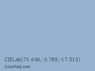 CIELab 71.646,-3.789,-17.513 Color is a light blue color and the nearest color is Rock Blue #9eb1cd. Hex code #95b3cf and RGB value is rgb(149,179,207). In RGB color space, this color is composed of 58% red, 70% green, 81% blue, In CMYK color space, this color is composed of 28% cyan, 14% magenta, 0% yellow , 19% black , In HSL color space, this color has a hue angle of 209° , 38% saturation and 70% lightness.