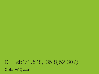 CIELab 71.648,-36.8,62.307 Color is a normal green color and the nearest color is Atlantis #97cd2d. Hex code #8dbf30 and RGB value is rgb(141,191,48). In RGB color space, this color is composed of 55% red, 75% green, 19% blue, In CMYK color space, this color is composed of 26% cyan, 0% magenta, 75% yellow , 25% black , In HSL color space, this color has a hue angle of 81° , 60% saturation and 47% lightness.