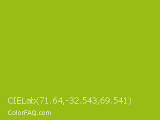 CIELab 71.64,-32.543,69.541 Color is a normal lime color and the nearest color is Pistachio Green #9dc209. Hex code #98bd15 and RGB value is rgb(152,189,21). In RGB color space, this color is composed of 60% red, 74% green, 8% blue, In CMYK color space, this color is composed of 20% cyan, 0% magenta, 89% yellow , 26% black , In HSL color space, this color has a hue angle of 73° , 80% saturation and 41% lightness.