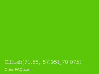 CIELab 71.65,-57.951,70.075 Color is a normal green color and the nearest color is Kelly Green #4cbb17. Hex code #5cc708 and RGB value is rgb(92,199,8). In RGB color space, this color is composed of 36% red, 78% green, 3% blue, In CMYK color space, this color is composed of 54% cyan, 0% magenta, 96% yellow , 22% black , In HSL color space, this color has a hue angle of 94° , 92% saturation and 41% lightness.