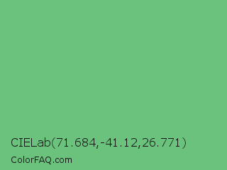 CIELab 71.684,-41.12,26.771 Color is a normal green color and the nearest color is Iguana Green #71bc78. Hex code #6bc27d and RGB value is rgb(107,194,125). In RGB color space, this color is composed of 42% red, 76% green, 49% blue, In CMYK color space, this color is composed of 45% cyan, 0% magenta, 36% yellow , 24% black , In HSL color space, this color has a hue angle of 132° , 42% saturation and 59% lightness.