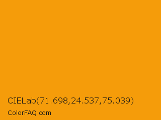 CIELab 71.698,24.537,75.039 Color is a normal orange color and the nearest color is Orange RYB #fb9902. Hex code #f59c0a and RGB value is rgb(245,156,10). In RGB color space, this color is composed of 96% red, 61% green, 4% blue, In CMYK color space, this color is composed of 0% cyan, 36% magenta, 96% yellow , 4% black , In HSL color space, this color has a hue angle of 37° , 92% saturation and 50% lightness.