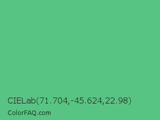 CIELab 71.704,-45.624,22.98 Color is a normal green color and the nearest color is Emerald #50c878. Hex code #58c484 and RGB value is rgb(88,196,132). In RGB color space, this color is composed of 35% red, 77% green, 52% blue, In CMYK color space, this color is composed of 55% cyan, 0% magenta, 33% yellow , 23% black , In HSL color space, this color has a hue angle of 144° , 48% saturation and 56% lightness.