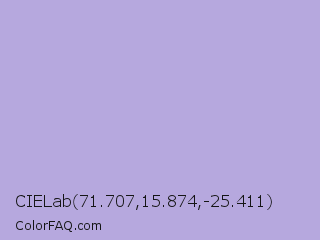 CIELab 71.707,15.874,-25.411 Color is a light indigo color and the nearest color is Maximum Blue Purple #acace6. Hex code #b6a8de and RGB value is rgb(182,168,222). In RGB color space, this color is composed of 71% red, 66% green, 87% blue, In CMYK color space, this color is composed of 18% cyan, 24% magenta, 0% yellow , 13% black , In HSL color space, this color has a hue angle of 256° , 45% saturation and 76% lightness.