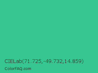 CIELab 71.725,-49.732,14.859 Color is a normal green color and the nearest color is Shamrock #33cc99. Hex code #35c693 and RGB value is rgb(53,198,147). In RGB color space, this color is composed of 21% red, 78% green, 58% blue, In CMYK color space, this color is composed of 73% cyan, 0% magenta, 26% yellow , 22% black , In HSL color space, this color has a hue angle of 159° , 58% saturation and 49% lightness.