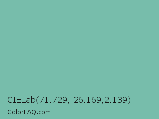 CIELab 71.729,-26.169,2.139 Color is a normal cyan color and the nearest color is Gulf Stream #80b3ae. Hex code #77bdab and RGB value is rgb(119,189,171). In RGB color space, this color is composed of 47% red, 74% green, 67% blue, In CMYK color space, this color is composed of 37% cyan, 0% magenta, 10% yellow , 26% black , In HSL color space, this color has a hue angle of 165° , 35% saturation and 60% lightness.