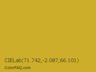 CIELab 71.742,-2.087,66.101 Color is a normal yellow color and the nearest color is Hokey Pokey #c8a528. Hex code #ccae2a and RGB value is rgb(204,174,42). In RGB color space, this color is composed of 80% red, 68% green, 16% blue, In CMYK color space, this color is composed of 0% cyan, 15% magenta, 79% yellow , 20% black , In HSL color space, this color has a hue angle of 49° , 66% saturation and 48% lightness.