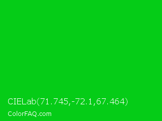 CIELab 71.745,-72.1,67.464 Color is a normal green color and the nearest color is Vivid Malachite #00cc33. Hex code #05cc17 and RGB value is rgb(5,204,23). In RGB color space, this color is composed of 2% red, 80% green, 9% blue, In CMYK color space, this color is composed of 98% cyan, 0% magenta, 89% yellow , 20% black , In HSL color space, this color has a hue angle of 125° , 95% saturation and 41% lightness.