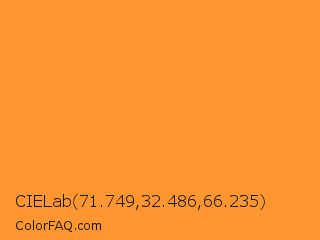 CIELab 71.749,32.486,66.235 Color is a normal orange color and the nearest color is Neon Carrot Crayola #ff9933. Hex code #ff9630 and RGB value is rgb(255,150,48). In RGB color space, this color is composed of 100% red, 59% green, 19% blue, In CMYK color space, this color is composed of 0% cyan, 41% magenta, 81% yellow , 0% black , In HSL color space, this color has a hue angle of 30° , 100% saturation and 59% lightness.