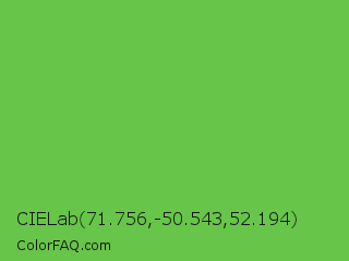 CIELab 71.756,-50.543,52.194 Color is a normal green color and the nearest color is Mantis #74c365. Hex code #67c549 and RGB value is rgb(103,197,73). In RGB color space, this color is composed of 40% red, 77% green, 29% blue, In CMYK color space, this color is composed of 48% cyan, 0% magenta, 63% yellow , 23% black , In HSL color space, this color has a hue angle of 105° , 52% saturation and 53% lightness.