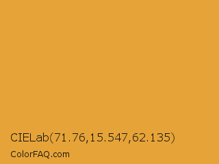 CIELab 71.76,15.547,62.135 Color is a normal orange color and the nearest color is Tulip Tree #eab33b. Hex code #e6a338 and RGB value is rgb(230,163,56). In RGB color space, this color is composed of 90% red, 64% green, 22% blue, In CMYK color space, this color is composed of 0% cyan, 29% magenta, 76% yellow , 10% black , In HSL color space, this color has a hue angle of 37° , 78% saturation and 56% lightness.