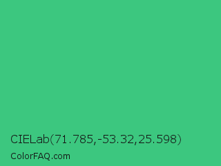CIELab 71.785,-53.32,25.598 Color is a normal green color and the nearest color is UFO Green #3cd070. Hex code #3cc77f and RGB value is rgb(60,199,127). In RGB color space, this color is composed of 24% red, 78% green, 50% blue, In CMYK color space, this color is composed of 70% cyan, 0% magenta, 36% yellow , 22% black , In HSL color space, this color has a hue angle of 149° , 55% saturation and 51% lightness.