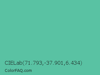 CIELab 71.793,-37.901,6.434 Color is a normal green color and the nearest color is Tradewind #5fb3ac. Hex code #59c2a3 and RGB value is rgb(89,194,163). In RGB color space, this color is composed of 35% red, 76% green, 64% blue, In CMYK color space, this color is composed of 54% cyan, 0% magenta, 16% yellow , 24% black , In HSL color space, this color has a hue angle of 162° , 46% saturation and 55% lightness.