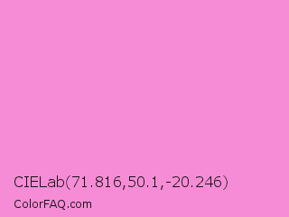 CIELab 71.816,50.1,-20.246 Color is a light magenta color and the nearest color is Princess Perfume #ff85cf. Hex code #f78cd6 and RGB value is rgb(247,140,214). In RGB color space, this color is composed of 97% red, 55% green, 84% blue, In CMYK color space, this color is composed of 0% cyan, 43% magenta, 13% yellow , 3% black , In HSL color space, this color has a hue angle of 319° , 87% saturation and 76% lightness.