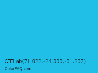 CIELab 71.822,-24.333,-31.237 Color is a normal cyan color and the nearest color is Scooter #2ebfd4. Hex code #20bfe8 and RGB value is rgb(32,191,232). In RGB color space, this color is composed of 13% red, 75% green, 91% blue, In CMYK color space, this color is composed of 86% cyan, 18% magenta, 0% yellow , 9% black , In HSL color space, this color has a hue angle of 192° , 81% saturation and 52% lightness.
