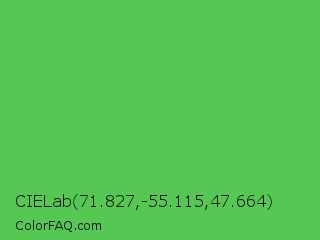 CIELab 71.827,-55.115,47.664 Color is a normal green color and the nearest color is Fern #63b76c. Hex code #55c753 and RGB value is rgb(85,199,83). In RGB color space, this color is composed of 33% red, 78% green, 33% blue, In CMYK color space, this color is composed of 57% cyan, 0% magenta, 58% yellow , 22% black , In HSL color space, this color has a hue angle of 119° , 51% saturation and 55% lightness.
