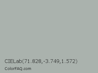 CIELab 71.828,-3.749,1.572 Color is a light green color and the nearest color is Silver Chalice #acacac. Hex code #aab2ad and RGB value is rgb(170,178,173). In RGB color space, this color is composed of 67% red, 70% green, 68% blue, In CMYK color space, this color is composed of 4% cyan, 0% magenta, 3% yellow , 30% black , In HSL color space, this color has a hue angle of 143° , 5% saturation and 68% lightness.