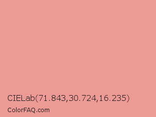 CIELab 71.843,30.724,16.235 Color is a light red color and the nearest color is Sea Pink #ed989e. Hex code #ee9a94 and RGB value is rgb(238,154,148). In RGB color space, this color is composed of 93% red, 60% green, 58% blue, In CMYK color space, this color is composed of 0% cyan, 35% magenta, 38% yellow , 7% black , In HSL color space, this color has a hue angle of 4° , 73% saturation and 76% lightness.