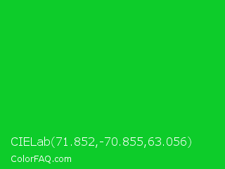 CIELab 71.852,-70.855,63.056 Color is a normal green color and the nearest color is Vivid Malachite #00cc33. Hex code #0dcc2a and RGB value is rgb(13,204,42). In RGB color space, this color is composed of 5% red, 80% green, 16% blue, In CMYK color space, this color is composed of 94% cyan, 0% magenta, 79% yellow , 20% black , In HSL color space, this color has a hue angle of 129° , 88% saturation and 43% lightness.