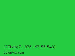 CIELab 71.876,-67,55.548 Color is a normal green color and the nearest color is Lime Green #32cd32. Hex code #25cb40 and RGB value is rgb(37,203,64). In RGB color space, this color is composed of 15% red, 80% green, 25% blue, In CMYK color space, this color is composed of 82% cyan, 0% magenta, 68% yellow , 20% black , In HSL color space, this color has a hue angle of 130° , 69% saturation and 47% lightness.