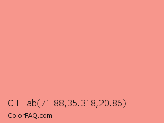 CIELab 71.88,35.318,20.86 Color is a light red color and the nearest color is Vivid Tangerine #ffa089. Hex code #f7968c and RGB value is rgb(247,150,140). In RGB color space, this color is composed of 97% red, 59% green, 55% blue, In CMYK color space, this color is composed of 0% cyan, 39% magenta, 43% yellow , 3% black , In HSL color space, this color has a hue angle of 6° , 87% saturation and 76% lightness.