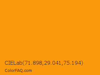 CIELab 71.898,29.041,75.194 Color is a normal orange color and the nearest color is West Side #ff910f. Hex code #fc990d and RGB value is rgb(252,153,13). In RGB color space, this color is composed of 99% red, 60% green, 5% blue, In CMYK color space, this color is composed of 0% cyan, 39% magenta, 95% yellow , 1% black , In HSL color space, this color has a hue angle of 35° , 98% saturation and 52% lightness.