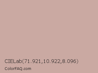 CIELab 71.921,10.922,8.096 Color is a light red color and the nearest color is Eunry #cfa39d. Hex code #caa9a2 and RGB value is rgb(202,169,162). In RGB color space, this color is composed of 79% red, 66% green, 64% blue, In CMYK color space, this color is composed of 0% cyan, 16% magenta, 20% yellow , 21% black , In HSL color space, this color has a hue angle of 11° , 27% saturation and 71% lightness.