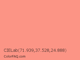CIELab 71.939,37.528,24.888 Color is a light red color and the nearest color is Vivid Tangerine #ff9980. Hex code #fc9485 and RGB value is rgb(252,148,133). In RGB color space, this color is composed of 99% red, 58% green, 52% blue, In CMYK color space, this color is composed of 0% cyan, 41% magenta, 47% yellow , 1% black , In HSL color space, this color has a hue angle of 8° , 95% saturation and 75% lightness.
