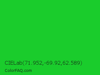 CIELab 71.952,-69.92,62.589 Color is a normal green color and the nearest color is Lime Green #32cd32. Hex code #1acc2c and RGB value is rgb(26,204,44). In RGB color space, this color is composed of 10% red, 80% green, 17% blue, In CMYK color space, this color is composed of 87% cyan, 0% magenta, 78% yellow , 20% black , In HSL color space, this color has a hue angle of 126° , 77% saturation and 45% lightness.