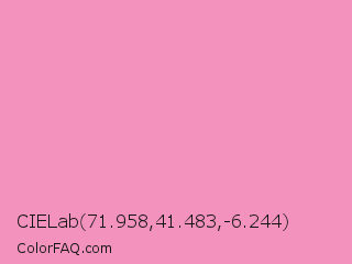 CIELab 71.958,41.483,-6.244 Color is a light rose color and the nearest color is Pastel Magenta #f49ac2. Hex code #f393bd and RGB value is rgb(243,147,189). In RGB color space, this color is composed of 95% red, 58% green, 74% blue, In CMYK color space, this color is composed of 0% cyan, 40% magenta, 22% yellow , 5% black , In HSL color space, this color has a hue angle of 334° , 80% saturation and 76% lightness.