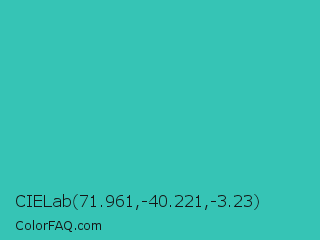 CIELab 71.961,-40.221,-3.23 Color is a normal cyan color and the nearest color is Maximum Blue Green #30bfbf. Hex code #36c4b5 and RGB value is rgb(54,196,181). In RGB color space, this color is composed of 21% red, 77% green, 71% blue, In CMYK color space, this color is composed of 72% cyan, 0% magenta, 8% yellow , 23% black , In HSL color space, this color has a hue angle of 174° , 57% saturation and 49% lightness.