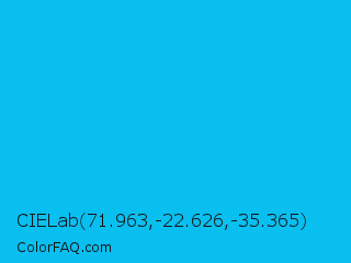 CIELab 71.963,-22.626,-35.365 Color is a normal cyan color and the nearest color is Cyan Process #00b7eb. Hex code #08bff0 and RGB value is rgb(8,191,240). In RGB color space, this color is composed of 3% red, 75% green, 94% blue, In CMYK color space, this color is composed of 97% cyan, 20% magenta, 0% yellow , 6% black , In HSL color space, this color has a hue angle of 193° , 94% saturation and 49% lightness.