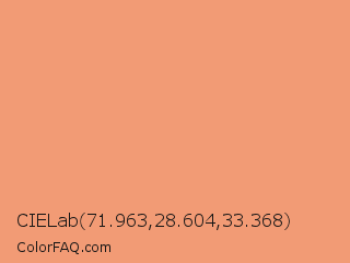 CIELab 71.963,28.604,33.368 Color is a light orange color and the nearest color is Apricot #eb9373. Hex code #f29b75 and RGB value is rgb(242,155,117). In RGB color space, this color is composed of 95% red, 61% green, 46% blue, In CMYK color space, this color is composed of 0% cyan, 36% magenta, 52% yellow , 5% black , In HSL color space, this color has a hue angle of 18° , 83% saturation and 70% lightness.