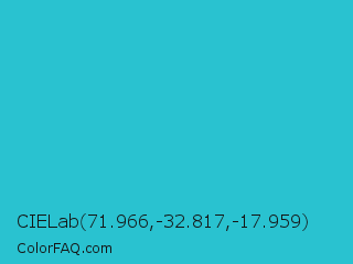 CIELab 71.966,-32.817,-17.959 Color is a normal cyan color and the nearest color is Scooter #2ebfd4. Hex code #29c2d0 and RGB value is rgb(41,194,208). In RGB color space, this color is composed of 16% red, 76% green, 82% blue, In CMYK color space, this color is composed of 80% cyan, 7% magenta, 0% yellow , 18% black , In HSL color space, this color has a hue angle of 185° , 67% saturation and 49% lightness.